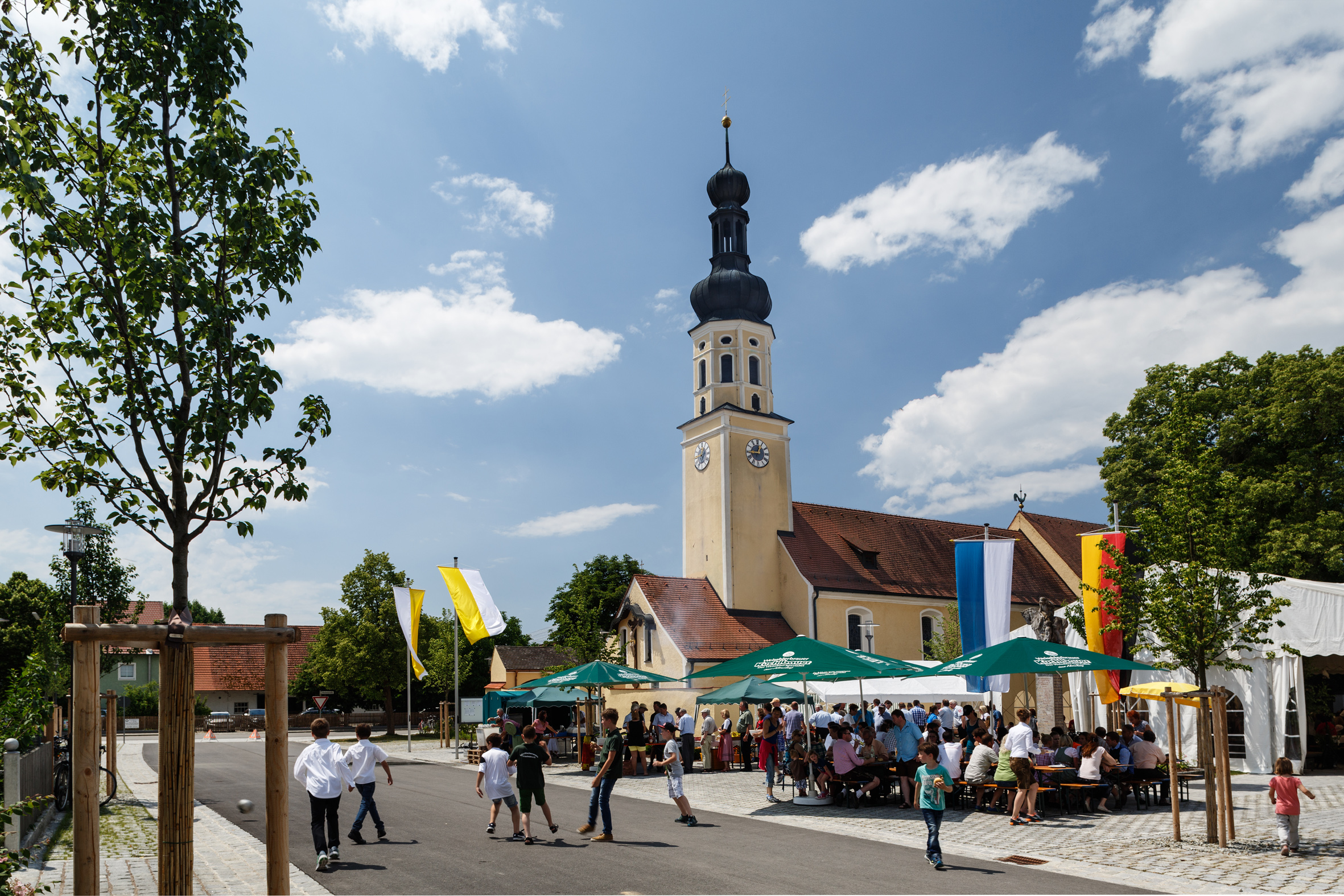 Die Uferstraße zwischen dem Dorfplatz und dem Haus der Vereine wurde durch den großflächigen Einsatz von Rasenfugenpflaster und die Pflanzung von 8 neuen Linden als Anger gestaltet. Zwei neue Bushäusl an der Hauptstraße und großzügige Anschlagtafeln mit Bänken vorm Kircheneingang stärken die Aufenthaltsqualität der Ortsmitte.