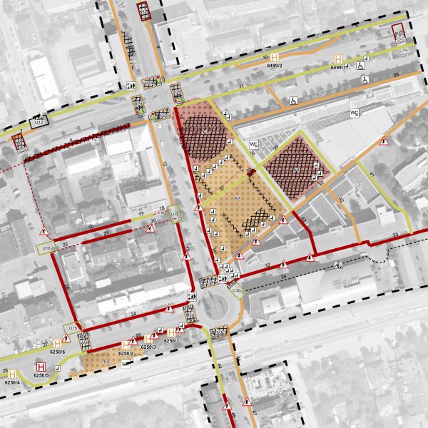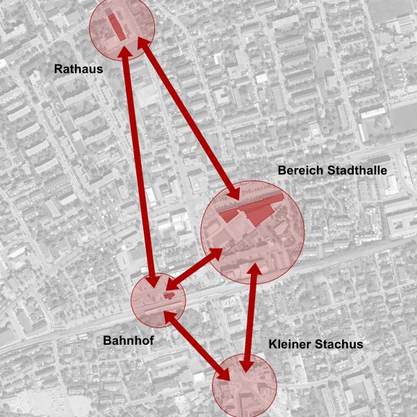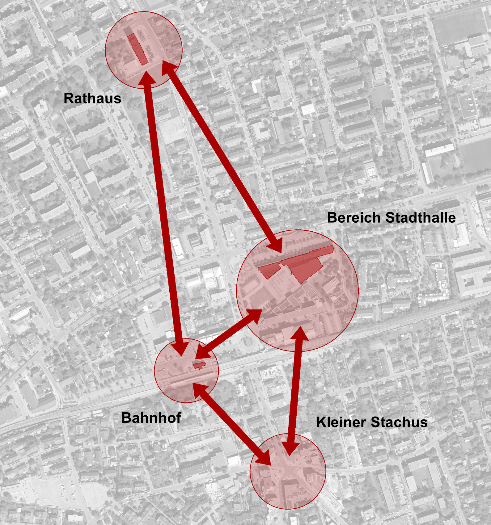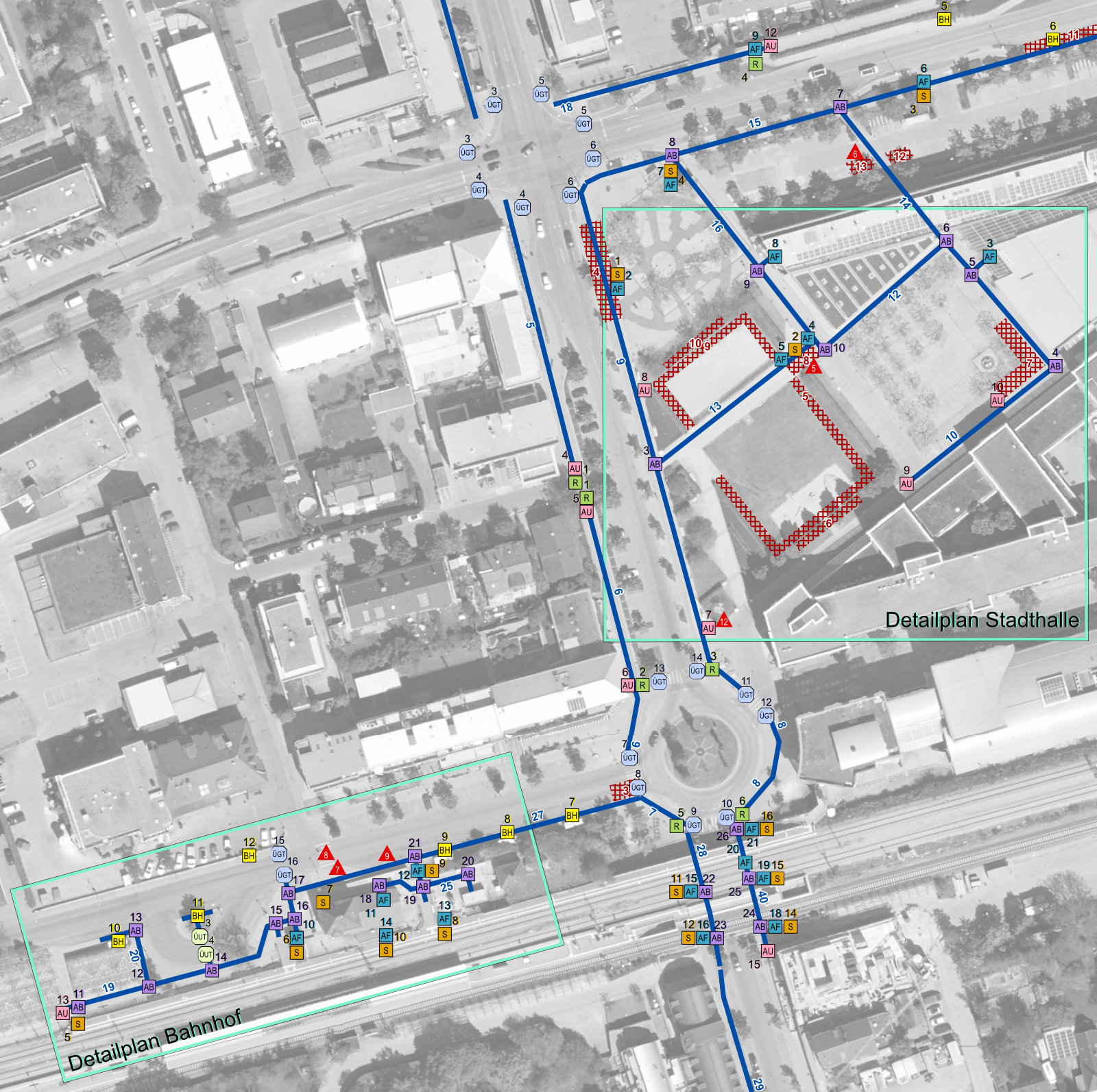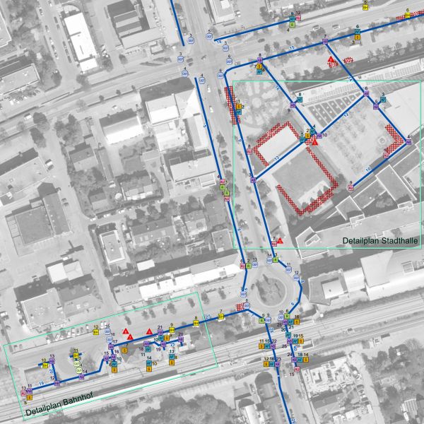 Nach einer umfassenden Bestandsaufnahme mit Bewertung der Barrierefreiheit sowohl für Menschen mit motorischen als auch für Menschen mit visuellen Einschränkungen, wurden in einer Lenkungsgruppe aus Politik, Mitgliedern der Stadtverwaltung, Teilhabebeirat und dem Büro raum + zeit gemeinsam Ziele definiert und Priorisierungen vorgenommen. In weiteren Schritten wurden mit dem Bereich Bahnhof und dem Bereich Stadthalle zwei Leuchtturmprojekte ausgewählt sowie konkrete Maßnahmen und eine Aufstellung der voraussichtlichen Kosten erarbeitet.