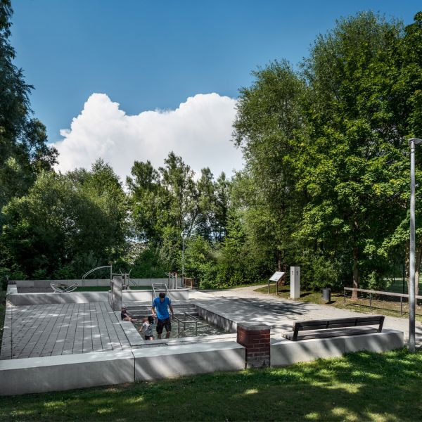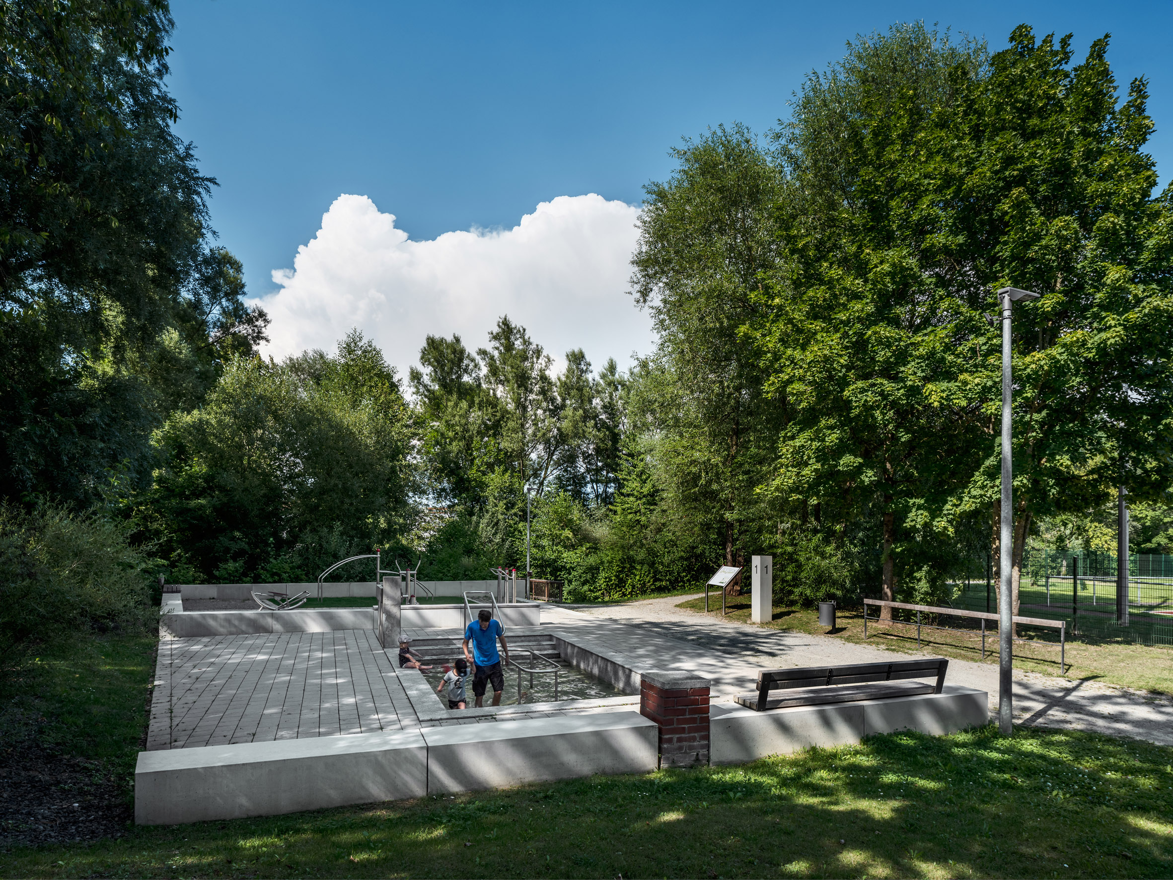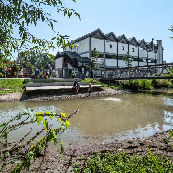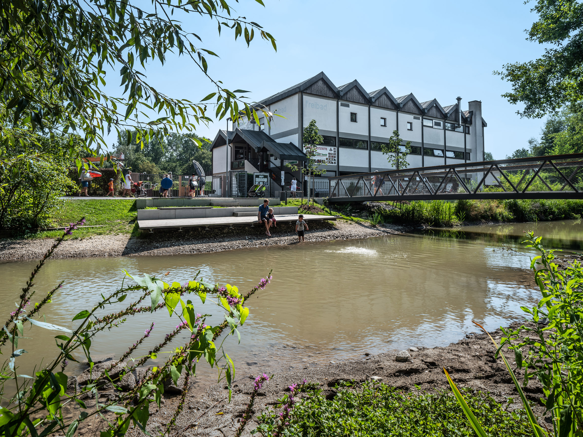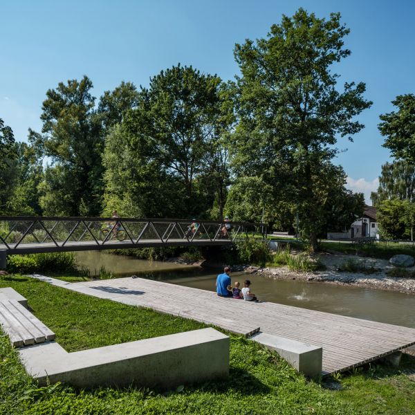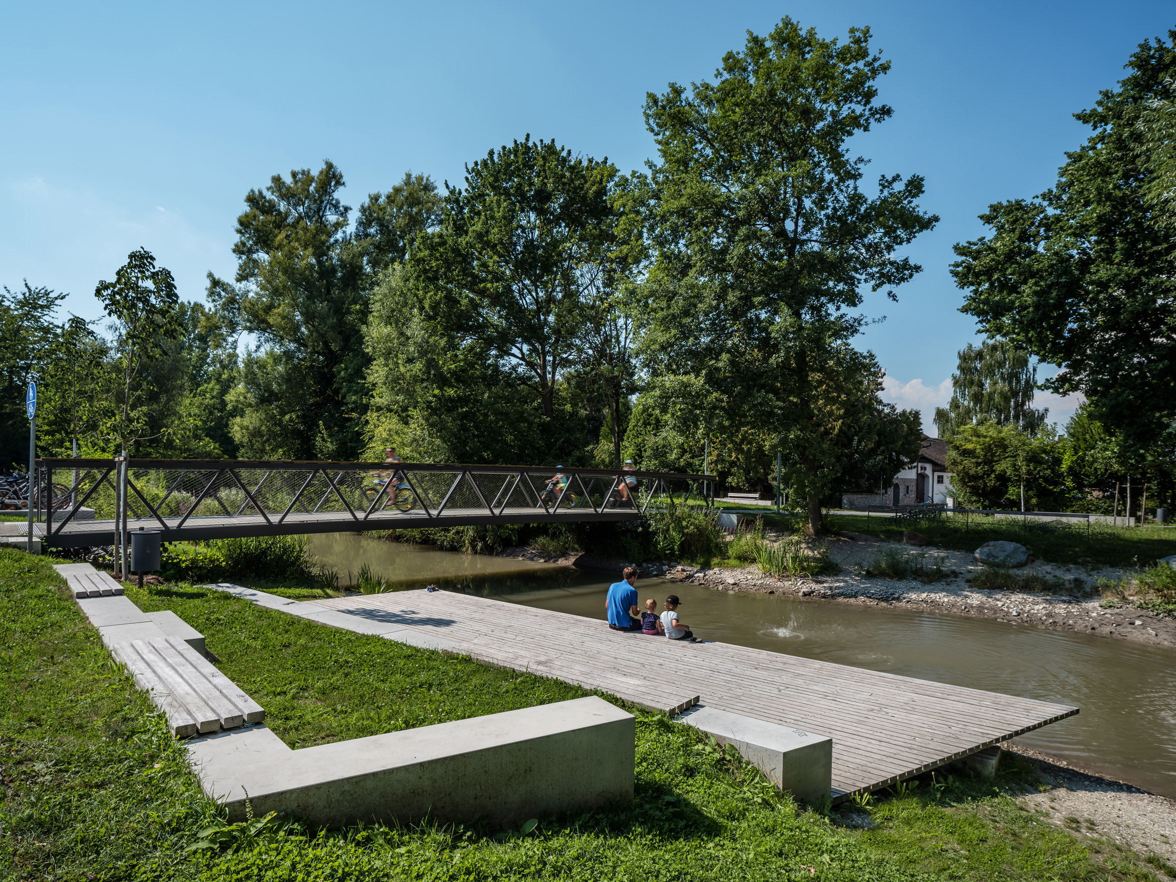Der Mühlbach wurde als großzügige Kontaktzone zwischen Siedlungsbereich und Erholung in der Natur entwickelt. Durch den Kontakt zum Wasser an neu angelegten Flachufern und einem Holzdeck wird der Bach als auwaldtypisches Element wieder zum Erlebnis.