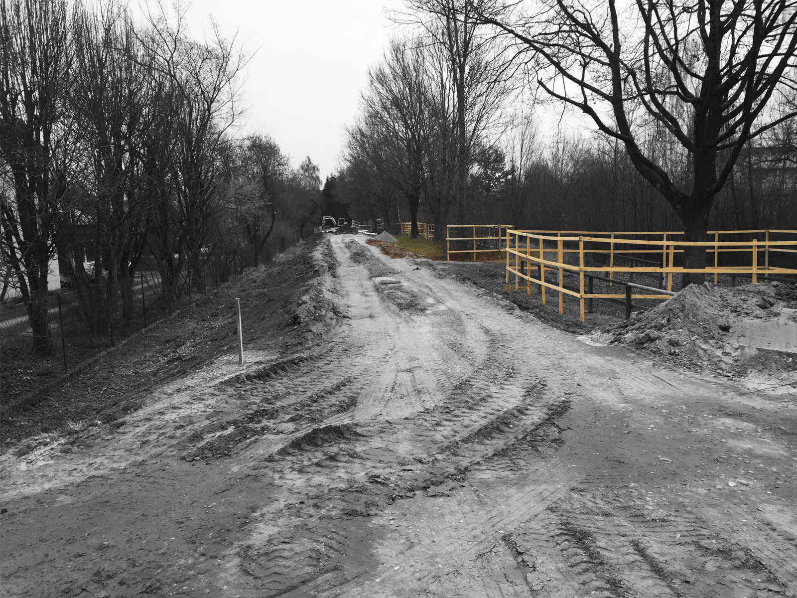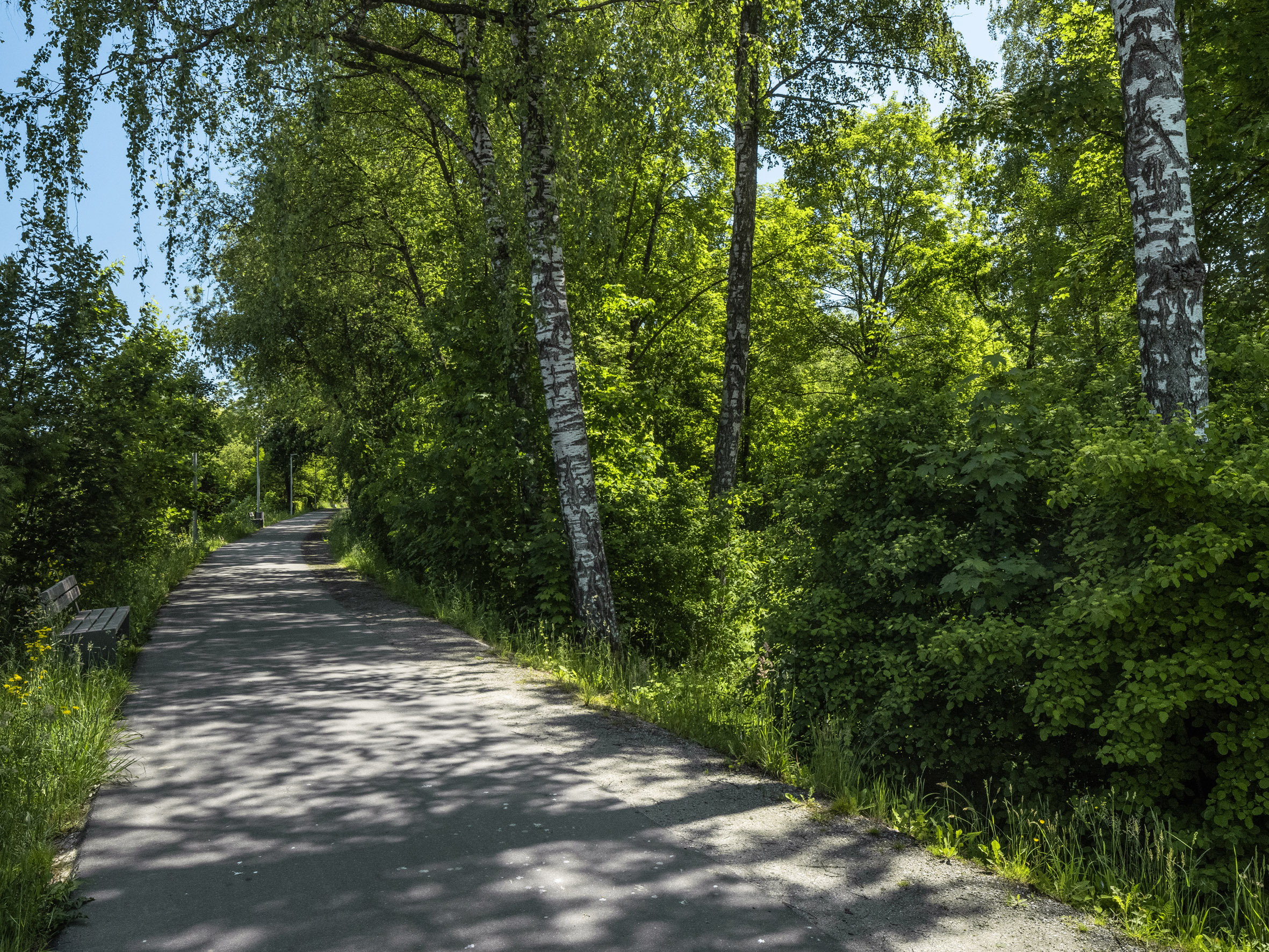 Der schmale aber beliebte Geh- und Radweg auf dem (heute funktionslosen) Hochwasserschutzdamm entlang des Mühlbaches wurde als breite Promenade neu gestaltet. Durch den Kontakt zum Wasser an neu angelegten Flachufern und einem Holzdeck wird der Bach als auwaldtypisches Element wieder zum Erlebnis.