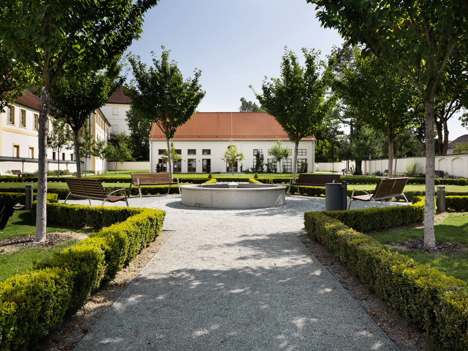 Vier von niederen Buchshecken eingefasste Flächen im nördlichen Teil des Pfarrgartens ordnen sich symmetrisch um einen neuen Granitbrunnen an und definieren die zwei barocken Achsen des Gartens. Das Parterre im zentralen Bereich wurde mit Bänken ausgestattet und mit Schatten spendenden Zierkirschen bepflanzt. Eine extensive Wiese mit Obstbaumreihen bildet einen harmonischen Übergang zum Pfarrheim, das im südlichen Teil der Anlage neu errichtet wurde. Als übergeordnetes Gestaltungselement wurden entlang der restaurierten Klostermauern schmale blühende Pflanz- bzw. Kräuterbeete geschaffen.