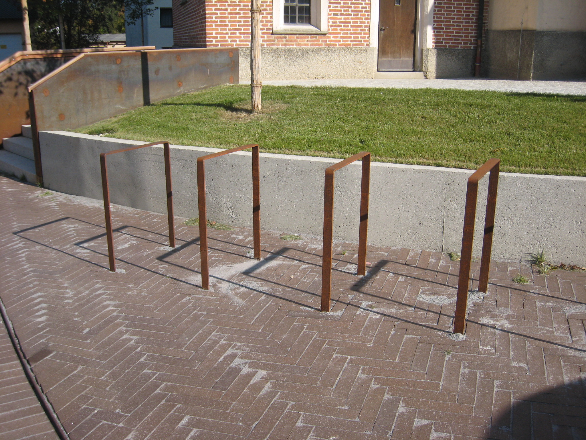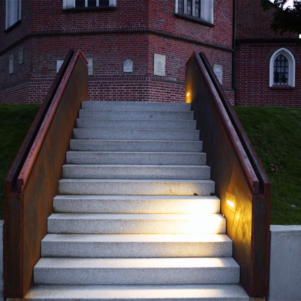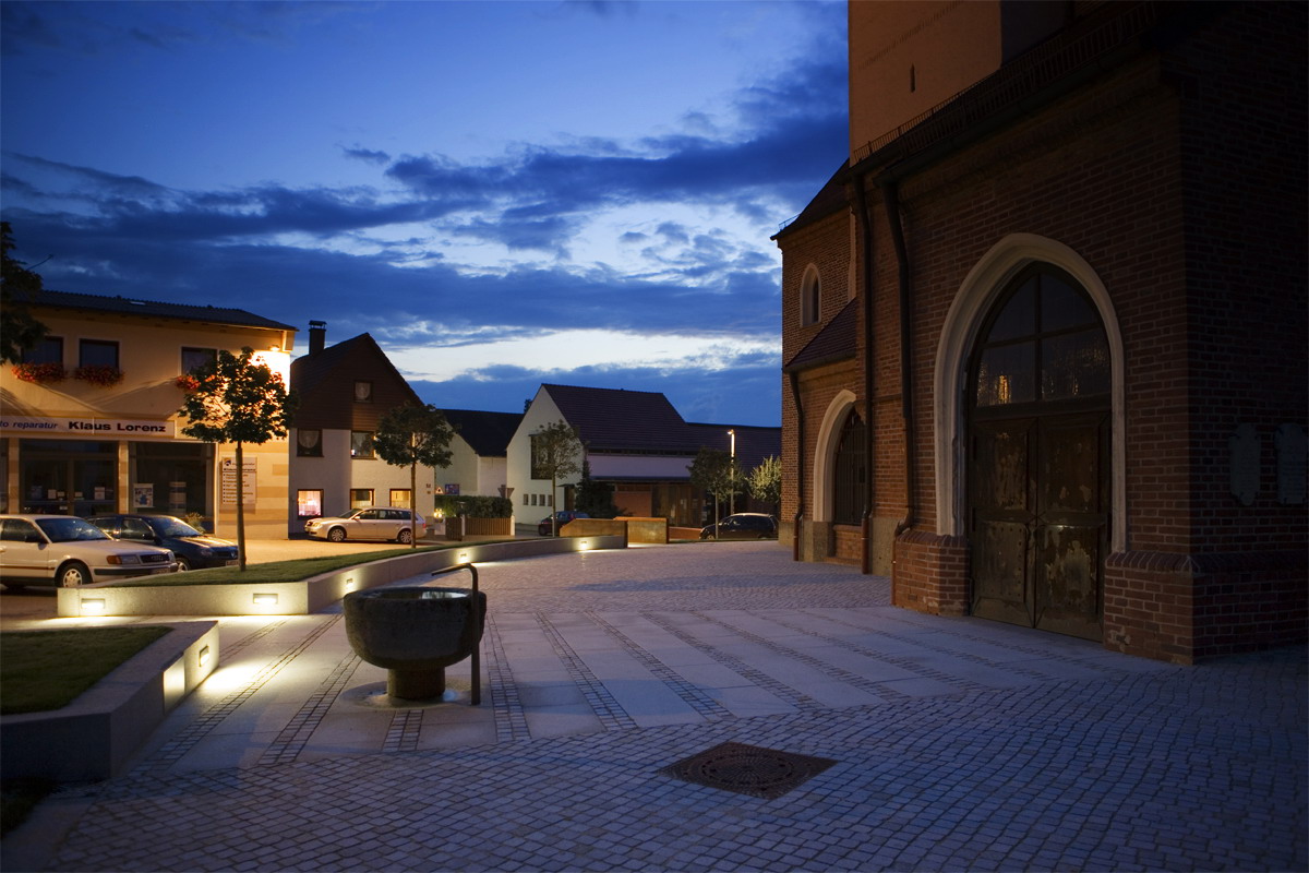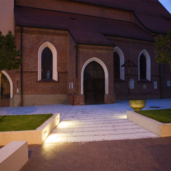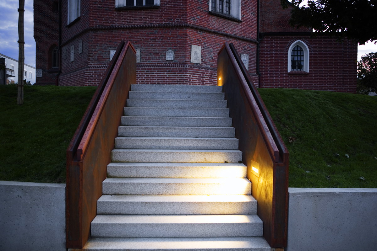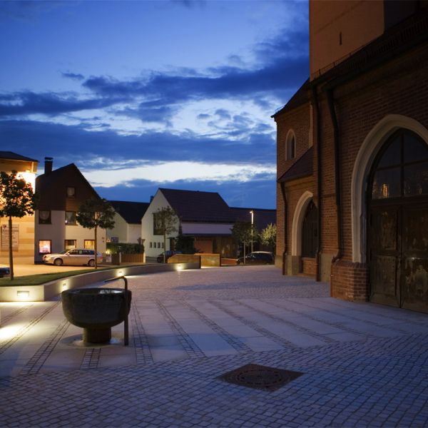 Die Besonderheit der Topographie mit der ovalen Figur um die Kirche bestimmt die Freiraumgestaltung. Der lückige Ring aus Kugelahornen wird wieder ergänzt, Stützmauer und Treppenaufgänge aus Cortenstahlwangen zeitlos-modern akzentuiert. Der Zugang vom Marktplatz her über Plattenbänder ist jetzt großzügig und barrierefrei. Das neue Pflaster im Netzverband erinnert an biblische Vorbilder.