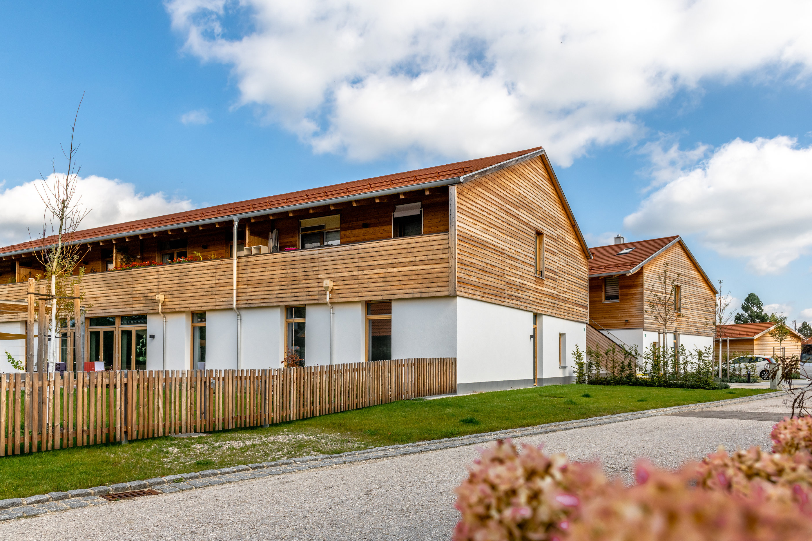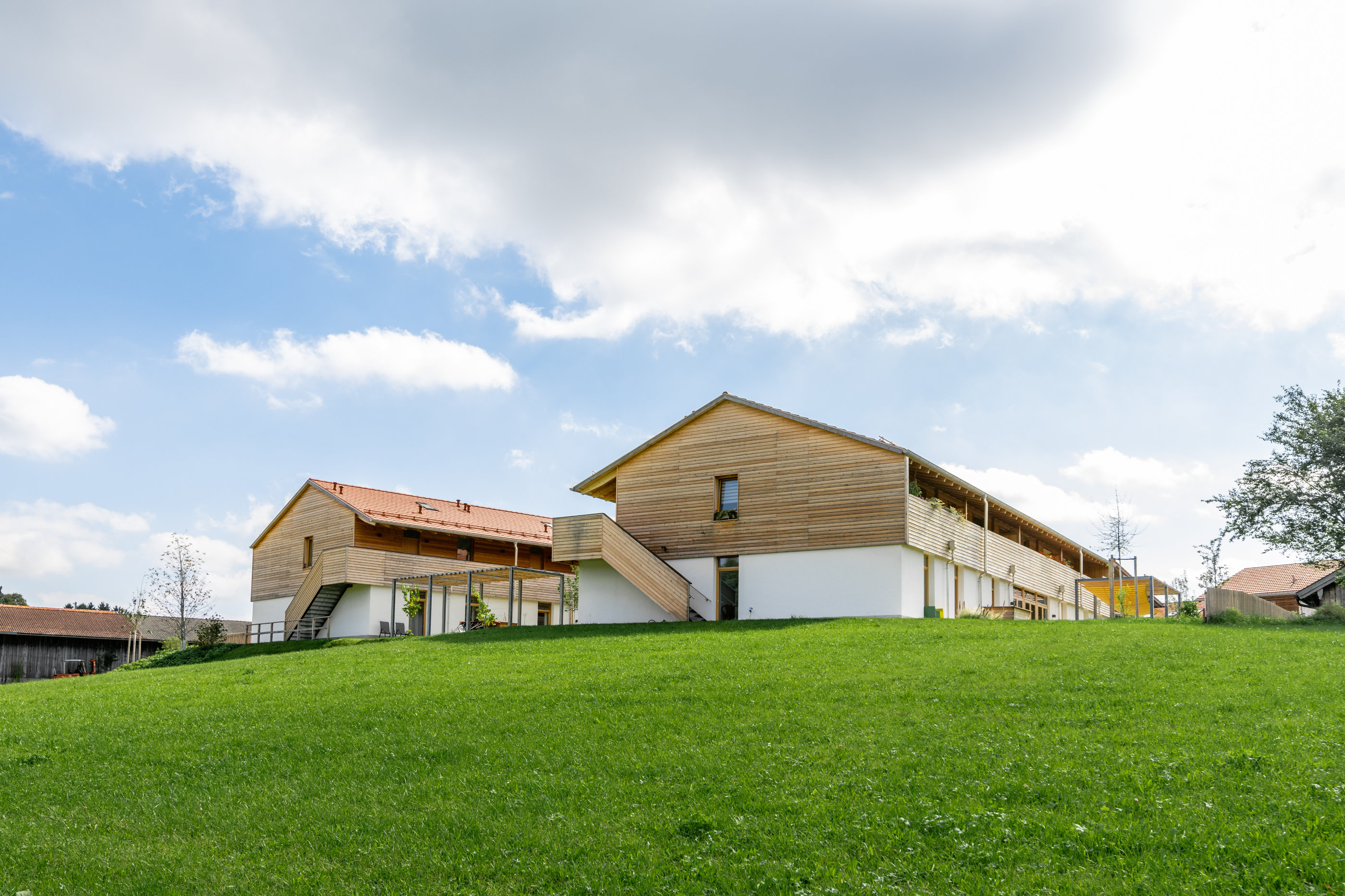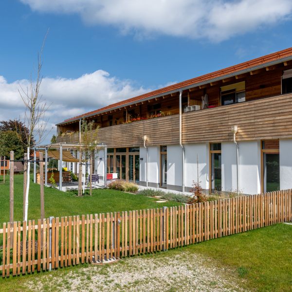 Dietramszell ist eine schöne historische Gemeinde und noch durch einen ländlichen Charakter und die Traditionen des Oberlandes geprägt. Das rund 700 Quadratmeter große und moderne Gebäude wurde daher traditionsbewusst mit hellem Holz verkleidet und mit einer flachen Dachneigung ausgeführt. Die Wohnanlage selbst ist in zwei Wohngruppen gegliedert: Im Erdgeschoss gibt es jeweils neun Einzelzimmer in einer Pflege- und einer Demenz-WG, die räumlich und wirtschaftlich voneinander getrennt sind. Die Bewohner können Kontakt haben, aber sie müssen nicht. Im Obergeschoss gibt es acht barrierefreie Mehrgenerationenwohnungen. Sie sind alle vermietet; eine junge Familie wohnt dort, Ehepaare und alleinstehende Senioren.