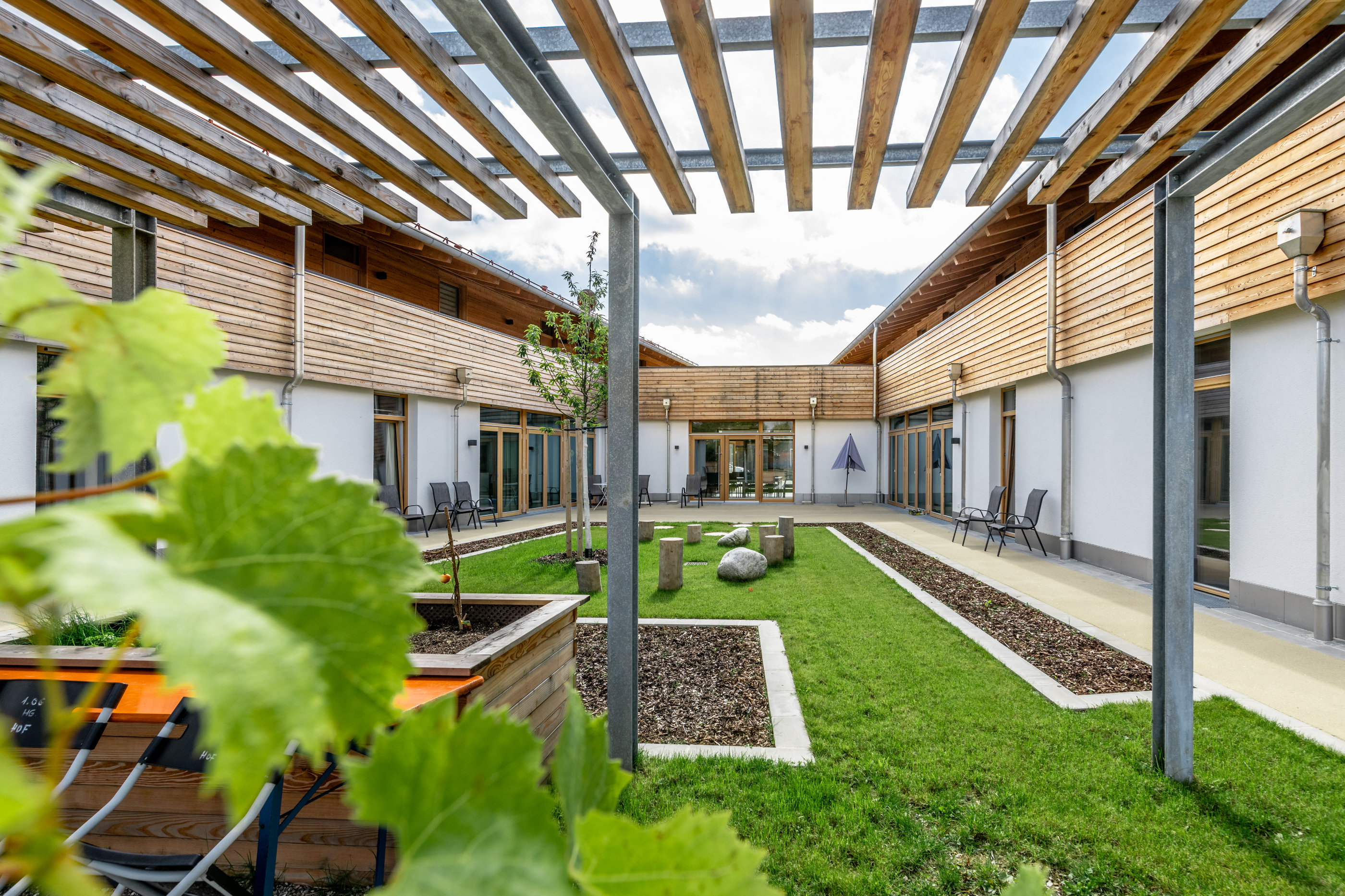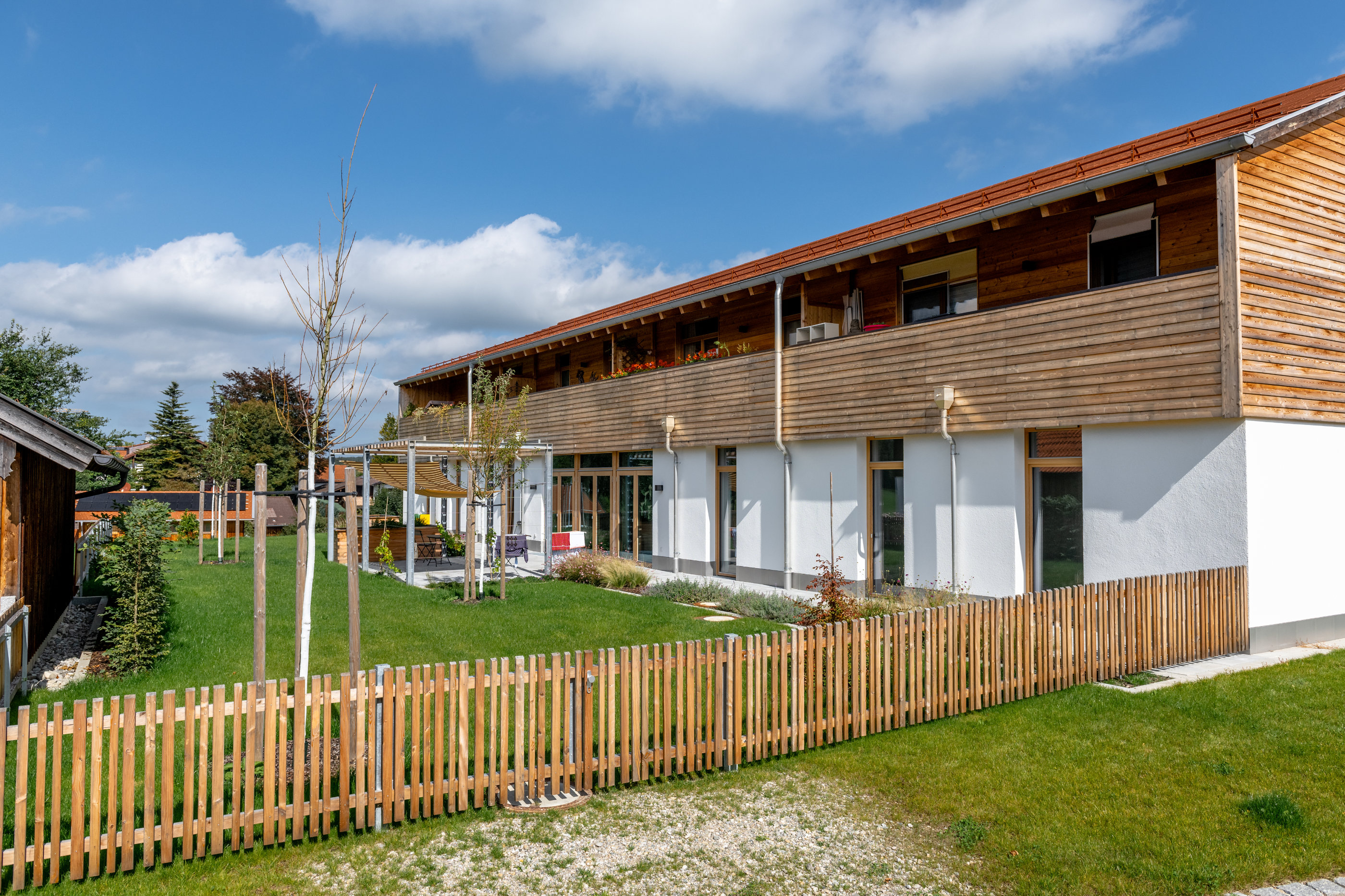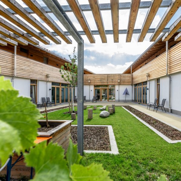 Beiden Wohneinheiten ist ein eigener, wohl strukturierter und gestalteter Garten zugeordnet, der mit je einer Schatten spendenden Pergola zum Verweilen im Grünen einlädt. Eine lange Terrasse verbindet die einzelnen Bewohnerzimmer im Außenbereich. Auf eine gehfreundliche und rollstuhl- bzw. rollatorengerechte Belagsgestaltung wurde dabei geachtet. In den Gärten wurden überwiegend Obstbäume (Birne und Apfel) und je ein Ziergehölz (Zierapfel/Zierkirsche) gepflanzt. Einzelne lockere Strauchgruppen aus ländlichen Ziersträuchern (z.B. Bauernjasmin, Mandelbäumchen, Kolkwitzie, Kupferfelsenbirne, Magnolie, Flieder etc.) bilden dezentrale Blickfänge. Heimische Straucharten wie Holunder und Hasel etc. rahmen das Grundstück zur Landschaft.
