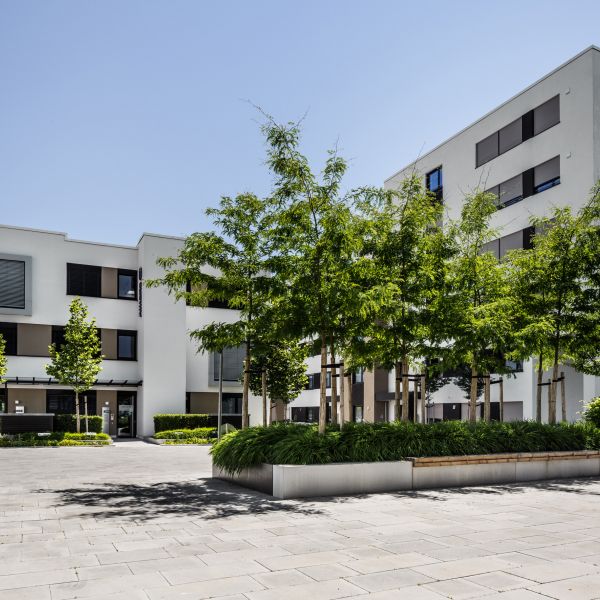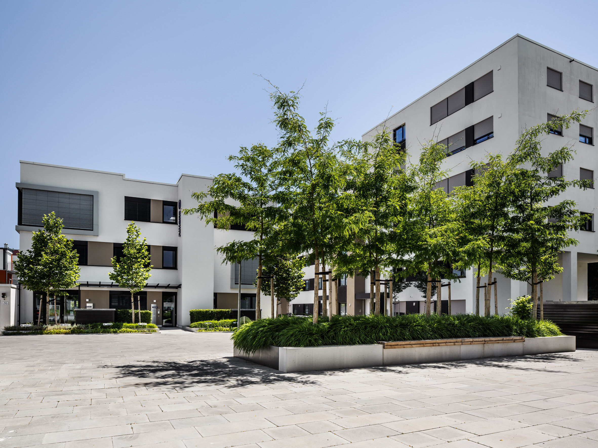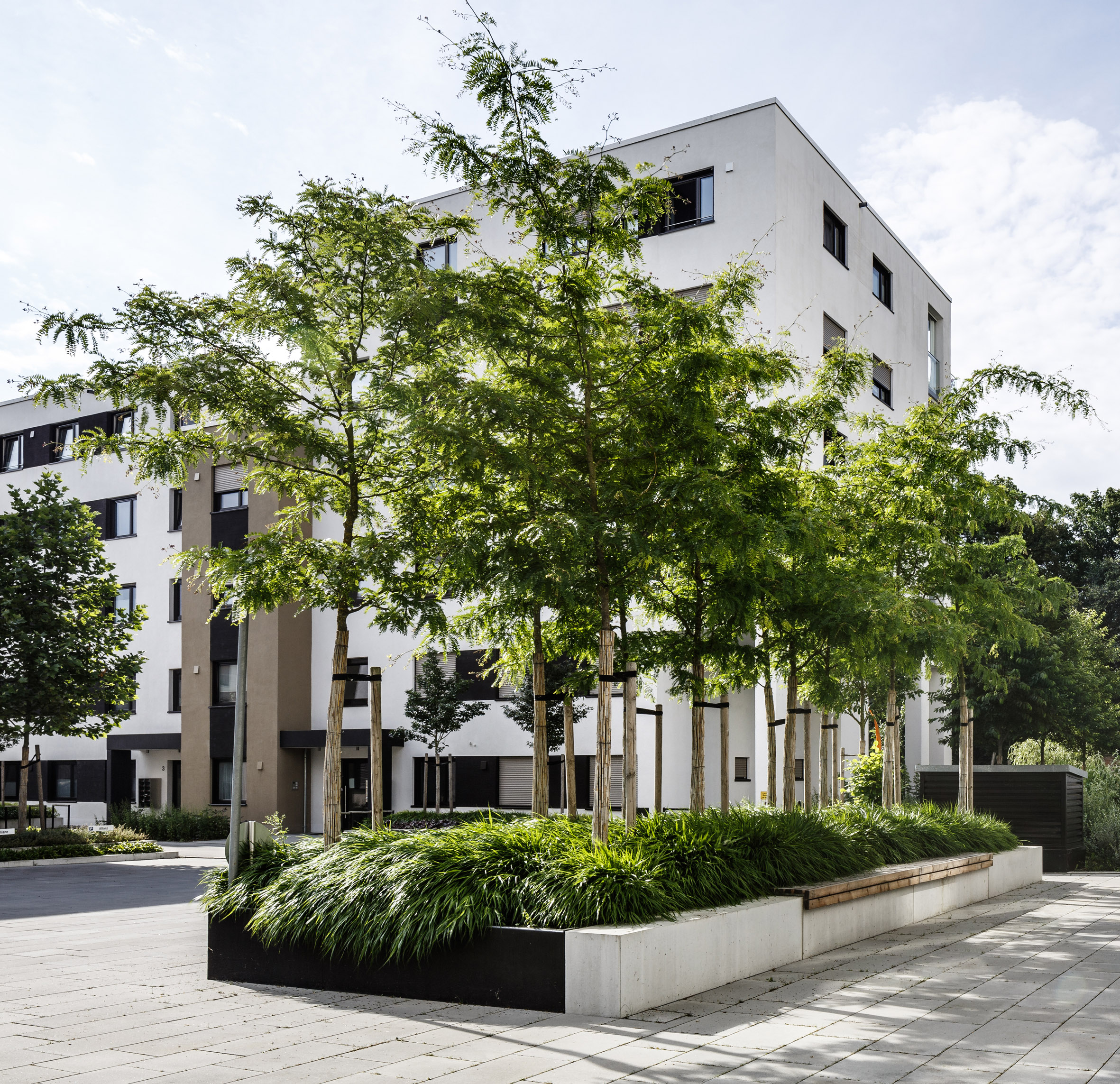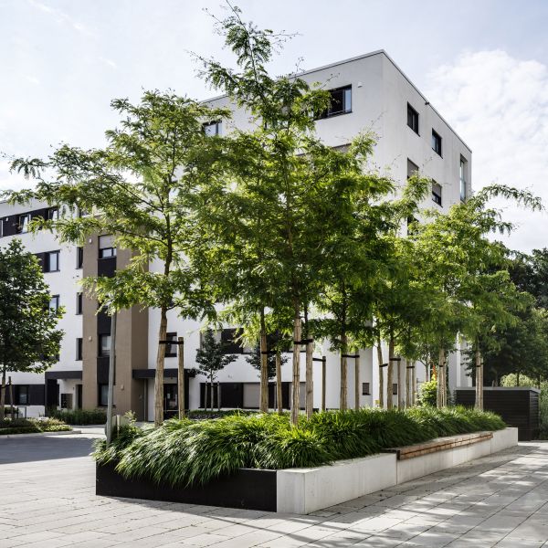 Der neue Quartiersplatz zwischen dem Wohngebäude und den zwei neuen Bürogebäuden erhielt dagegen einen urbanen Charakter. Drei große Hochbeete aus Stahl setzen mit einem Hain aus dicht gepflanzten Gleditischen einen farblichen Akzent auf dem mit großformatigen Betonplatten befestigten Platz.