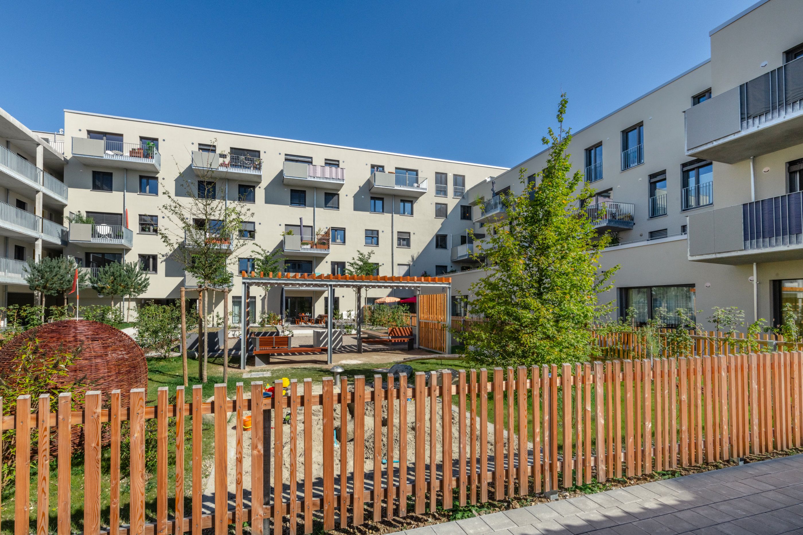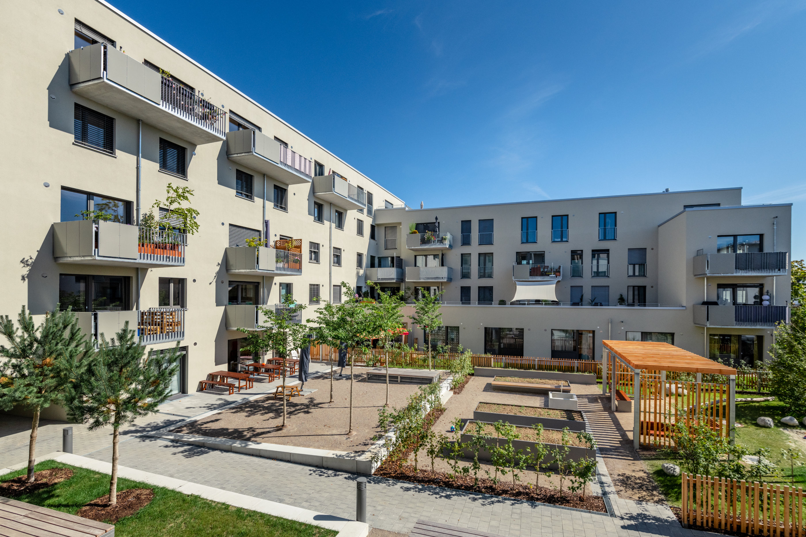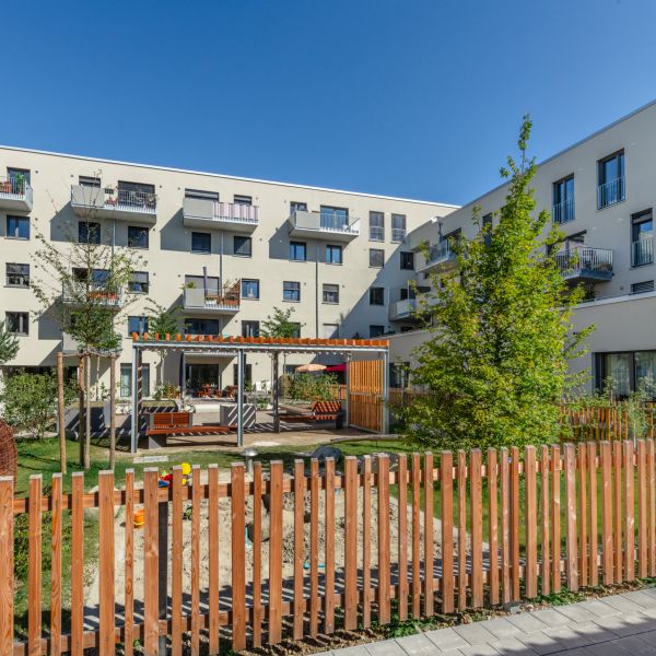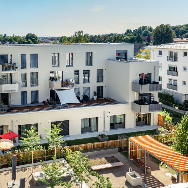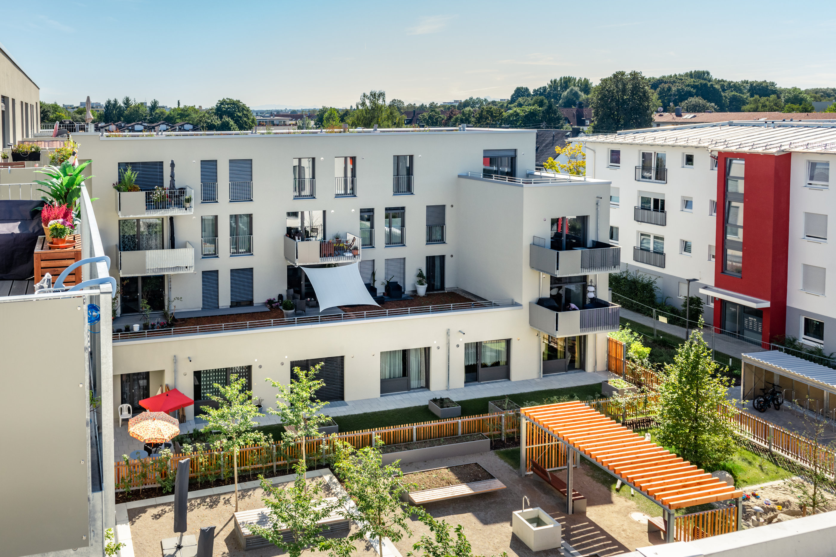 Eine Besonderheit: Die Apartments der Demenz-WG weisen private Freiflächen auf, die zur Biberger Straße hin mit einer innen angeböschten und bepflanzten Mauer abgeschlossen sind. Für die Demenzbewohner ist somit ein sicherer Rundlauf möglich. Durch die Erschließung mit Laubengängen wird neben einem guten Lärmschutz auch erreicht, dass die Feuerwehr weder den nördlichen Fußweg noch den Innenhof befahren muss. So kann der gesamte Innenhof begrünt werden ohne zusätzliche Versiegelungen. Was manchem Kritiker als „Gefängnisbau“ erscheint, ist innendrin eine grüne Oase. Großzügige Balkone, Loggien, Terrassen sowie ein großer Innenhof mit Kinderspieleinrichtungen.