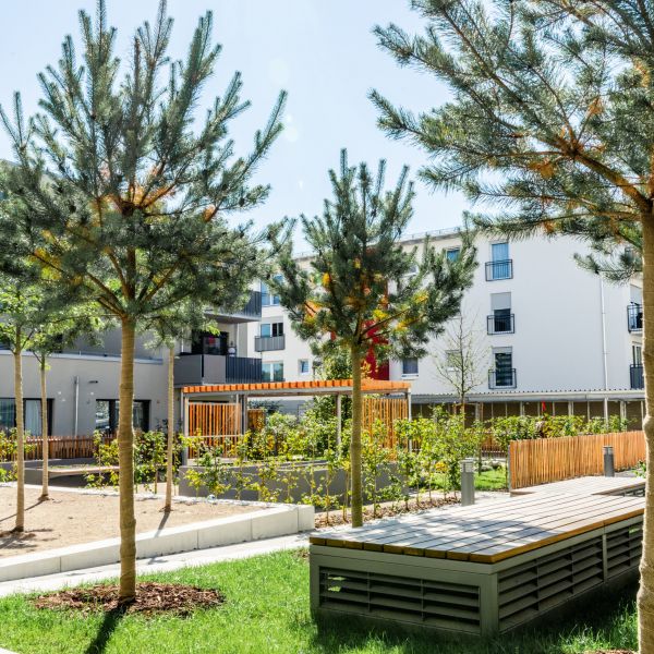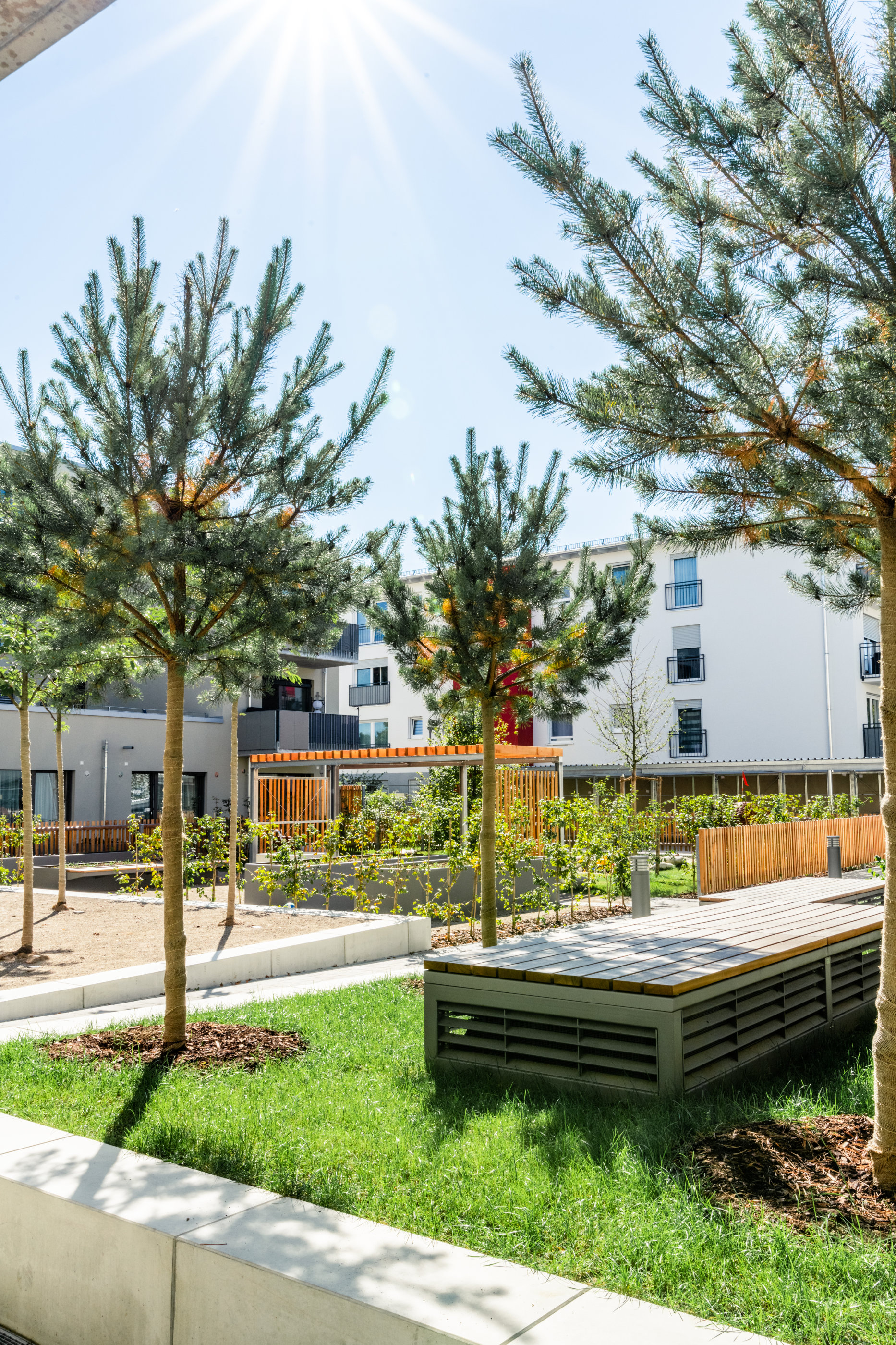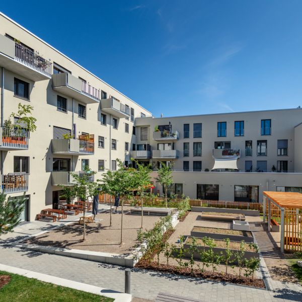 Durch die U-förmige Anordnung der Gebäude musste die vorgeschriebene Feuerwehrzufahrt nicht im Zentrum zwischen den Gebäuden bereit gestellt werden. Im Innenhof entstand so eine autofreie, kaum versiegelte und belebte Fläche, die von allen Bewohnerinnen und Bewohnern genutzt werden kann.
